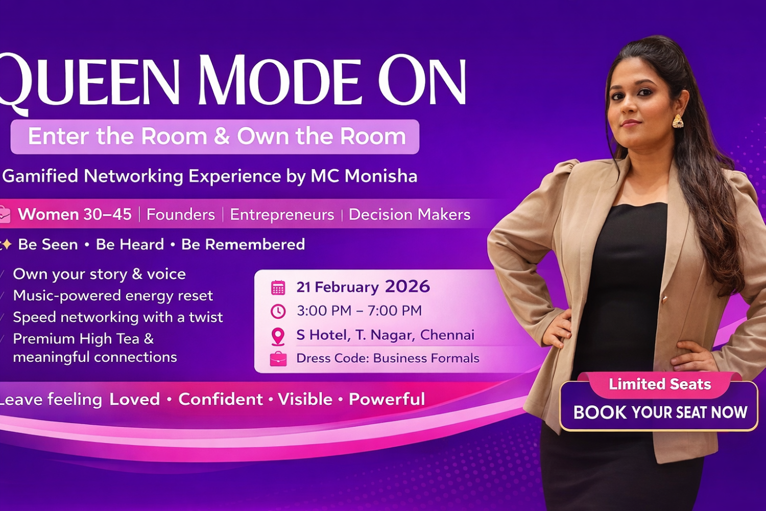 "Queen Mode On" is an exclusive hosted experience by Monisha for working professional women aged 25–50.